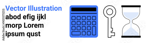 Calculator, key, and hourglass portraying concepts such as time, problem-solving, security, and productivity. Ideal for business, time management, education finance planning and simple landing