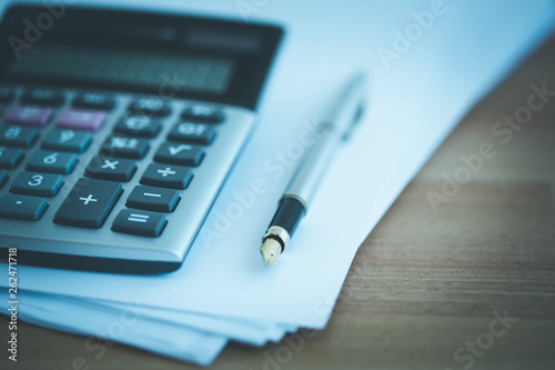 CALCULATOR, PEN AND WHITE PAPERS ON THE WOODEN TABLE CONCEPT