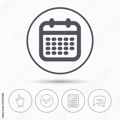 Calendar icon. Events reminder symbol. Chat speech bubbles. Check tick, report chart and hand click. Linear icons. Vector