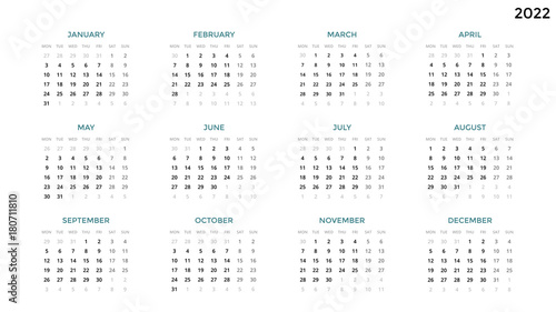 Calendar infographic, table chart, presentation chart. Business period concept. Task manager. Week, month. 2022 year. Time management. Organizer date diary. First day Monday.