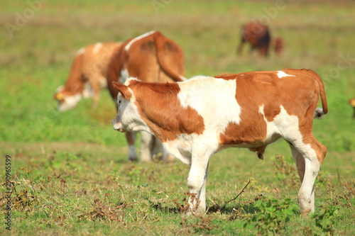 Calf on meadow, cows on pasture in background