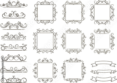 Calligraphic design elements . Decorative swirls or scrolls, vintage frames , flourishes, labels and dividers.