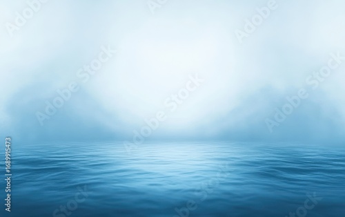 Calm blue water surface with soft misty fog and pale sky creating a serene and peaceful atmosphere
