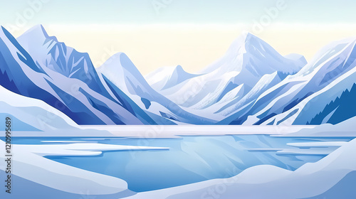 Calm icy fjord between snow-covered mountains. Icy Fjord. Illustration
