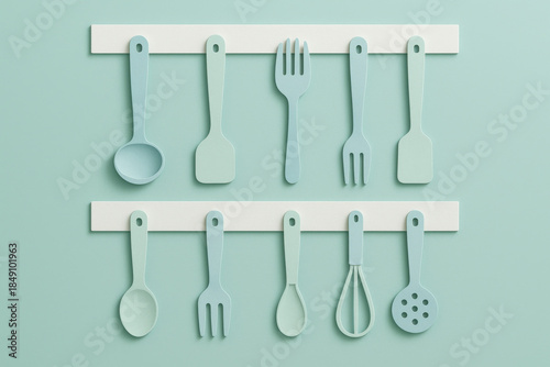 Calm pastel blue kitchen utensil set hanging on white rack demonstrates perfect organization. Clean aqua tool collection features neat storage and satisfying symmetry against wall