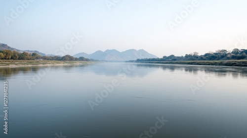 Calm river reflecting mountains, hazy morning, tranquil landscape, travel photography