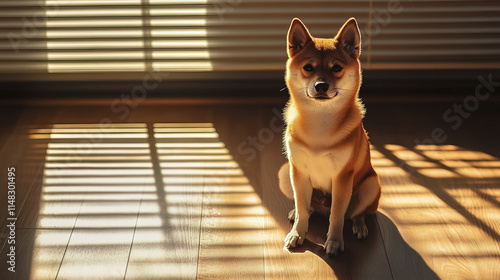 calm Shiba Inu sitting on wooden floor, illuminated by sunlight