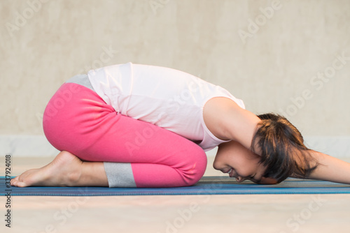 calmness and relax, female freedom happiness. home practice room background. little asian girl meditates while practicing yoga. child happiness. toned picture healthy life. yoga concept.