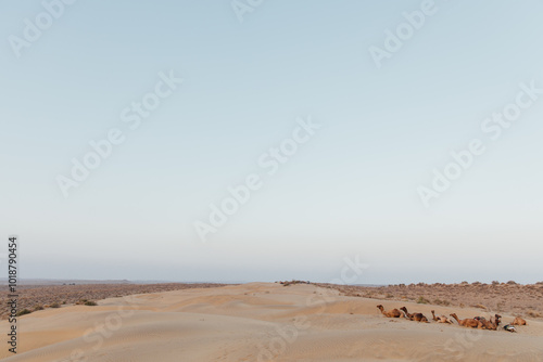 Camels lounge in the sand dunes at sunset