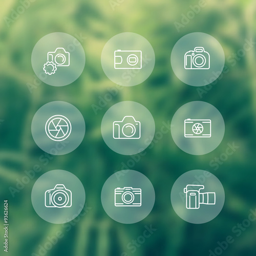 camera, dslr, diaphragm, round white line icons, vector illustration