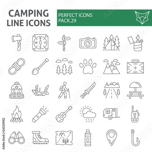 Camping thin line icon set, hiking symbols collection, vector sketches, logo illustrations, travel signs linear pictograms package isolated on white background.