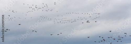 Canada gooses and snow gooses flying on the Saint-Laurent gulf in Canada, migration