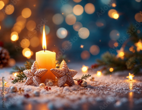 Candle lit in snow with Christmas decor.