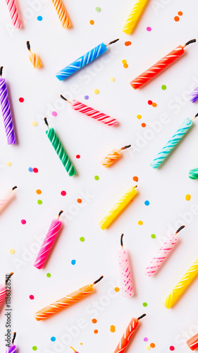 Candy-colored birthday candles scattered on a white background, flat lay.