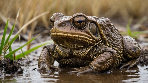 Cane Toad on Muddy Riverbank Surrounded by Grasses and Reeds