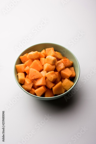 Cantaloupe / muskmelon / kharbuja cut into pieces, served in a bowl. selective focus