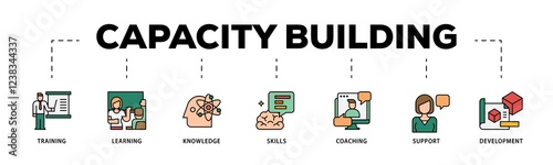Capacity building infographic icons flow process which consists of training, learning, knowledge, skills, coaching, support, and development icon live stroke and easy to edit .