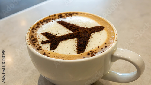 Cappucino coffee cup with plane chocolate powder decoration on the top and neutral table copyspace background