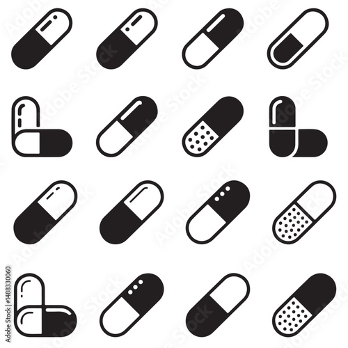 Capsule Pill Variations Line Art Illustrations, Collection of Various Capsule Pill Icons Black and White,