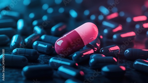 Capsule surrounded by dark pills on a contrasting background, vibrant colors.