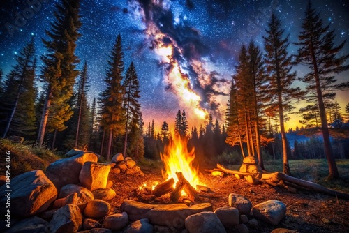 Captivating Campfire Scene at Nightfall in the Forest with Firelight and Starlight for Nature Photography and Outdoor