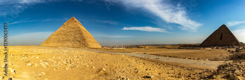Capture the pharaonic panorama of Keops and Mycerinus pyramids in Giza, Egypt. Witness the ancient wonders of the world in this historic landscape.