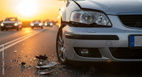 Car Accident on Highway at Sunset Damage Broken Headlight Insurance Claim Road Safety Traffic Collision Vehicle Crash Auto Repair Wreck Scene Emergency Services