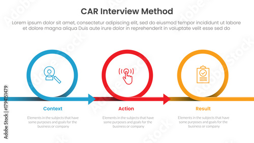CAR interview method infographic 3 point with circle or circular arrow right direction for slide presentation