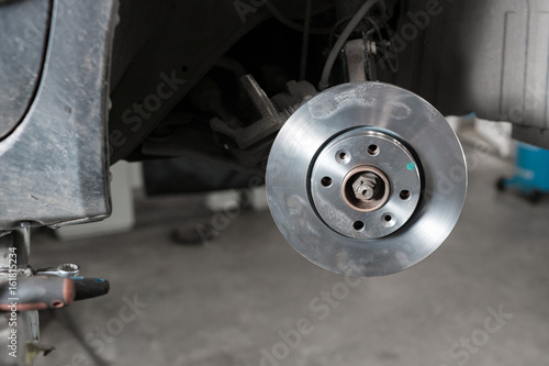 Car mechanic hands replace brakes in garage.