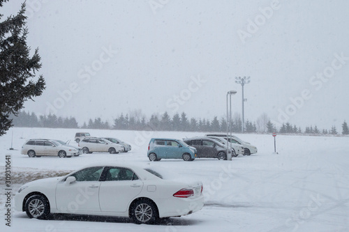 car on road in winter,The car is covered with snow.