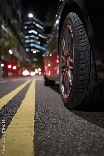 Car Tire on City Street at Night Low Angle Close Up of Vehicle Wheel in Urban Setting with Yellow Lines and Building Lights