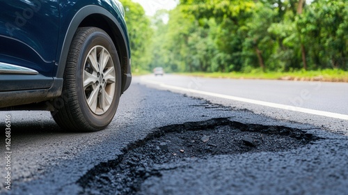 Car Wheel Near Road Pothole in Urban Area with Green Surroundings