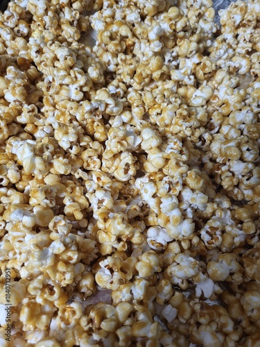 Caramel popcorn with glossy coating and golden texture, close-up view of sweet snack with crunchy surface and baked finish, warm tones and appealing contrast in natural light.
