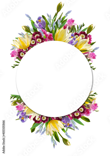 card with a garland of spring flowers with yellow tulips, freesias, primroses, crocuses and blue snowdrops