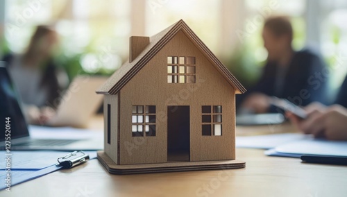 Cardboard house model, real estate meeting, office, contract signing