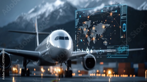 Cargo Management and Warehouse Scheduling Solutions concept. Futuristic airplane with digital map in mountainous landscape.