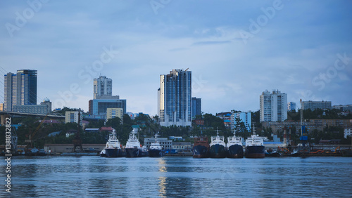 Cargo vessels docked at vladivostok seaport, golden bridge spanning cityscape under overcast sky
