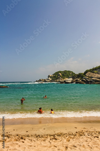 Caribbean beach with tropical forest in Tayrona National Park, Colombia. Tayrona National Park is located in the Caribbean Region in Colombia.