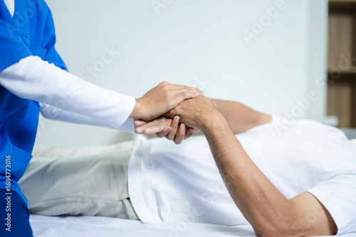 Caring therapist supports senior patient by holding hands. healthcare, elder care, rehab, emotional healing, human touch, and trust in medical environments.
