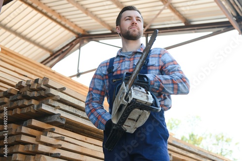 Carpenter in uniform check boards on sawmill