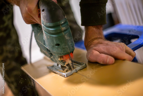 carpenter's hand using an electric jigsaw to cut wooden plywood. The plywood is cut into a precise shape, and the carpenter's hand is steady and confident.