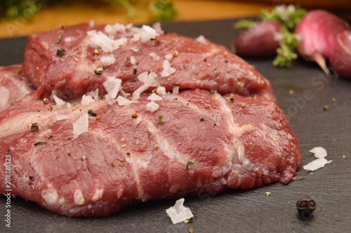 carrillada iberica, carne cruda, bodegon, macro, sal, pimienta
