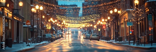 Cars drive along a city street as evening falls, with decorative lights creating a warm atmosphere in the chilly winter air. Generative AI