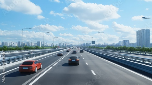 Cars traveling on a highway in a modern city under a clear blue sky