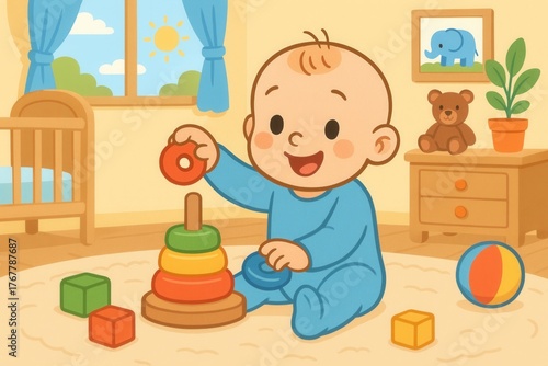 Cartoon baby playing with educational toys at home.