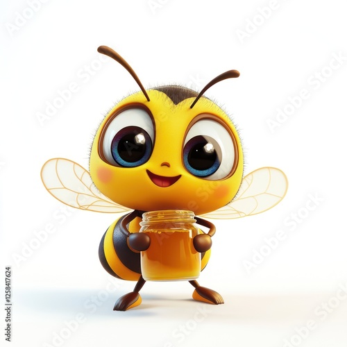 Cartoon bee holding honey jar, cute, isolated on white, for children's product