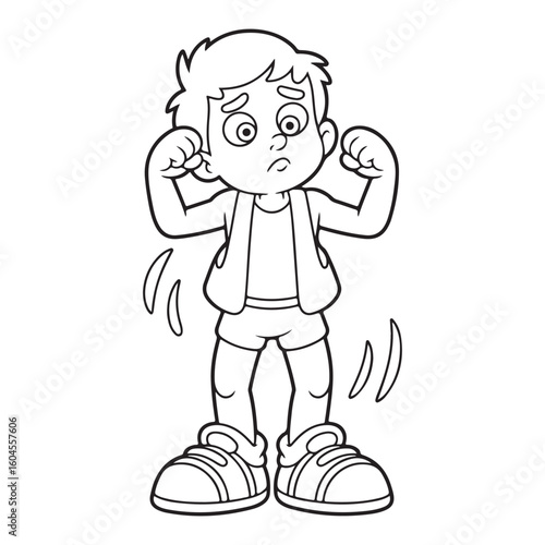 Cartoon boy flexing his muscles in black and white outline