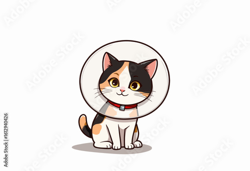 Cartoon cat wearing an Elizabethan collar sitting with a cute expression