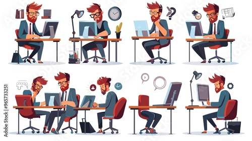 Cartoon characters engage in commercial activities in computer-based workplaces. The character works on a digital device, possibly typing on a keyboard or looking at a screen. Cartoon characters bring