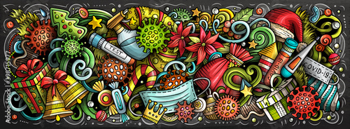 Cartoon cute doodles New Year and Coronavirus illustration.